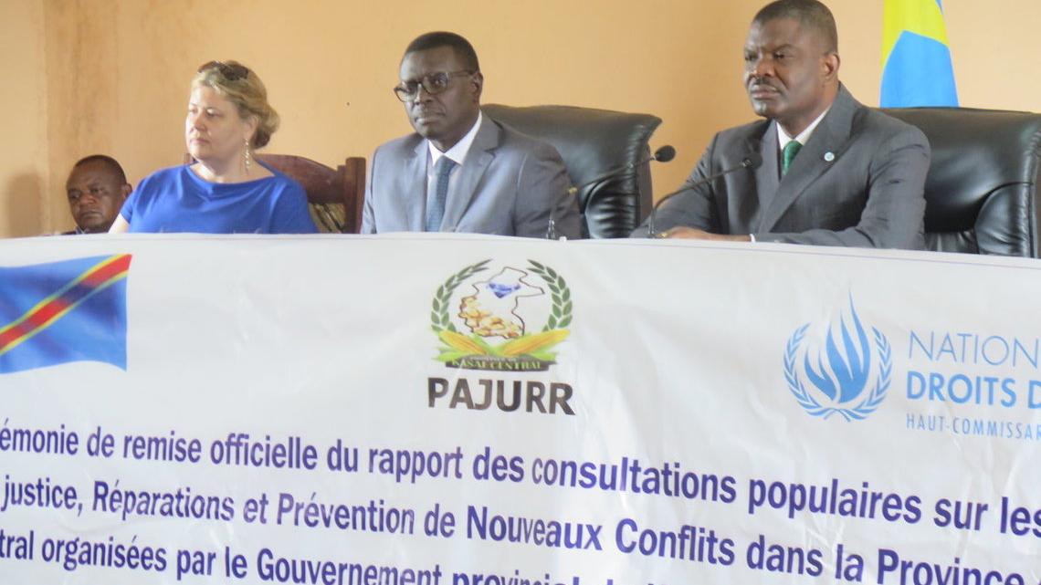 Kananga, le 5 février 2020 - Le Bureau conjoint des Nations unies aux droits de l’Homme (BCNUDH) et le Ministère Provincial de la justice et droits humains du Kasaï Central ont remis au Gouverneur de province le rapport des consultations populaires sur les besoins de justice, réparations et prévention de nouveaux conflits dans la province du Kasaï Central. Il ressort de ce rapport que la population du Kasaï Central est fortement favorable à la création d’une Commission provinciale de vérité, justice et réconciliation.