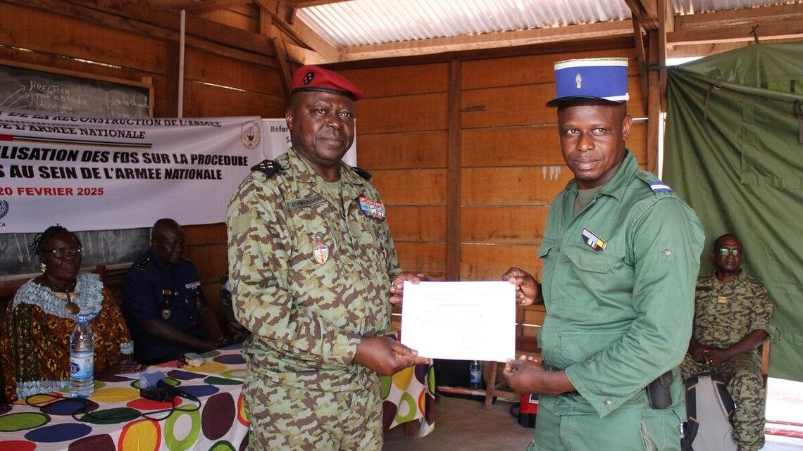 Le personnel en uniforme des Forces armées centrafricaines, de la gendarmerie, de la police, des douanes ainsi que du service des eaux et forêts a suivi des cours théoriques et des exercices pratiques sur ces procédures réglementaires de sanctions.