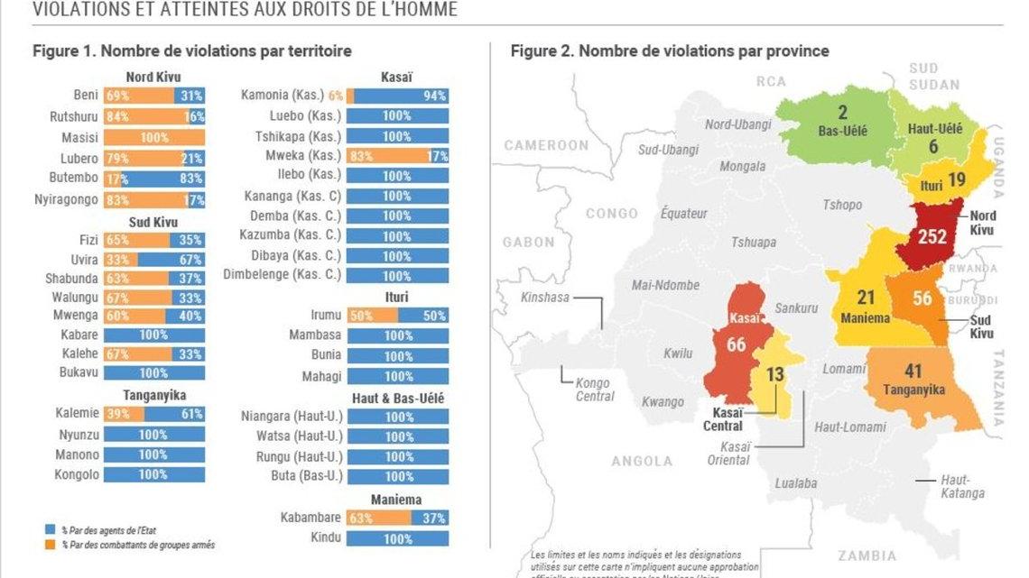 En septembre 2019, le BCNUDH a documenté 502 violations des droits de l’homme sur tout le territoire de la RDC, soit une augmentation de 10% par rapport au mois d’août (457 violations). Cette augmentation reflète une hausse significative du nombre d’atteintes attribuables aux groupes armés, en particulier Nyatura et divers autres groupes Maï-Maï actifs dans la province du Nord-Kivu. Le nombre de violations commises par des agents de l’Etat reste stable par rapport au mois précédent.