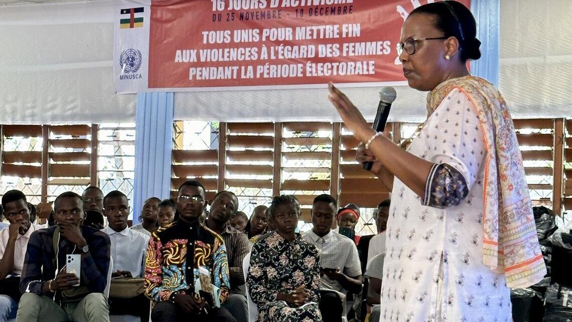 Ils étaient près de 300 étudiants de l’Université de Bangui à avoir échangé, ce 5 décembre 2024, avec la Représentante spéciale du Secrétaire général de l’ONU, Valentine Rugwabiza. Les discussions, qui ont eu lieu en présence du ministre de l’Enseignement supérieur et de la Recherche scientifique, Pr. Jean-Laurent Syssa-Magalé, ont essentiellement porté sur la violence à l’égard des femmes et des filles en milieu universitaire sous le prisme des droits de l'homme et les activités de la MINUSCA dans la mise en œuvre de son mandat. Il s’est aussi agi des opportunités de travail au sein du système des Nations Unies pour les étudiants diplômés.