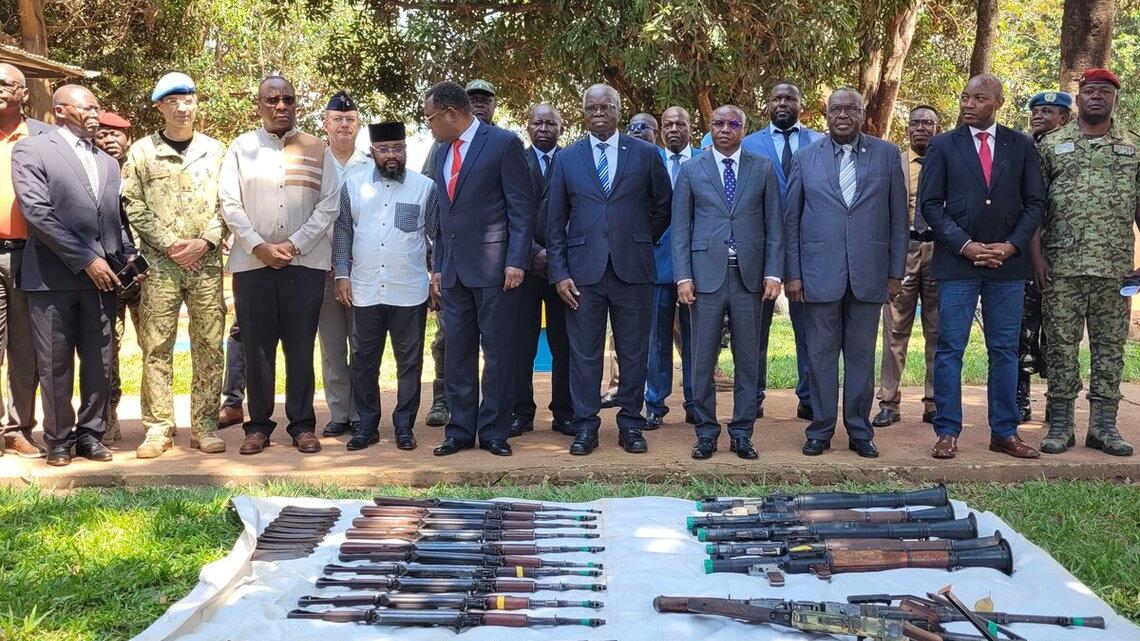 380 armes de guerre et des munitions ont été remises le 24 mai 2024 par le Ministère en charge du désarmement, démobilisation, réintégration et rapatriement (DDRR) au Ministère de la défense nationale. La cérémonie s’est déroulée à Bangui en présence du Ministre d’État Jean Willy Biro-Sako, de son homologue Claude Rameaux Bireau, ainsi que des partenaires techniques et financiers de la RCA, dont la MINUSCA. Cette remise est intervenue après le remontage, la vérification et le marquage des armes effectués par les experts de la MINUSCA, du Service de lutte antimines de l’ONU et de la Commission nationale de lutte contre la prolifération et la circulation illicite des armes légères et de petit calibre (COMNAT-ALPC).