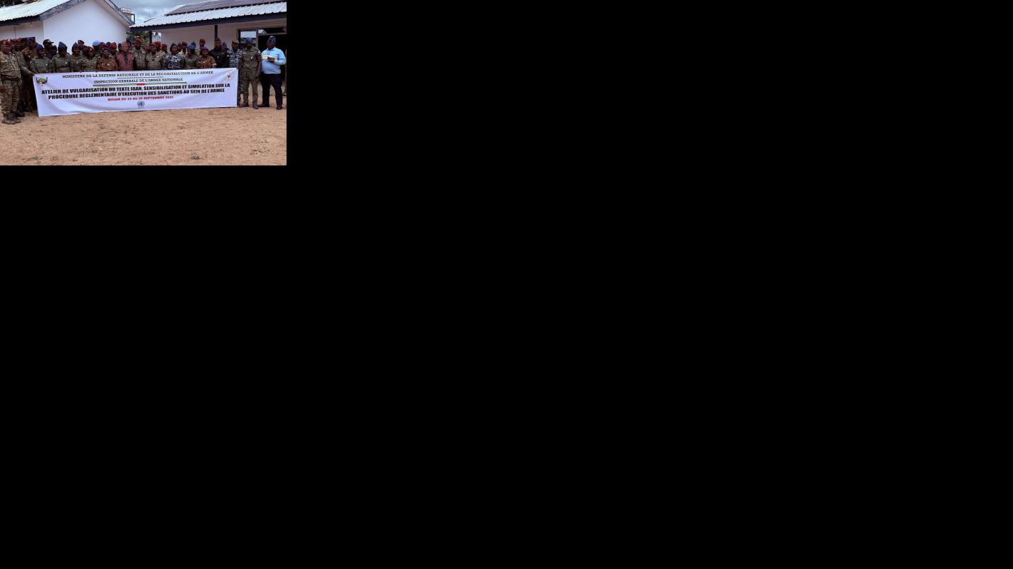Dans le cadre de la réforme du secteur de la sécurité en République centrafricaine, la MINUSCA appuie l’organisation d’un atelier de vulgarisation du texte de l’Inspection générale de l’armée nationale (IGAN), accompagné d’une sensibilisation et d’une simulation pour mieux comprendre les procédures réglementaires d’exécution des sanctions au sein de l’armée. Présidée par le Gouverneur de la région de l’Équateur, Honoré Kinda, cette activité se déroule du 24 au 29 septembre 2025. Elle vise à renforcer les capacités des militaires de la région et à améliorer l’efficacité de l’armée nationale en matière de gouvernance et de respect de la réglementation.
