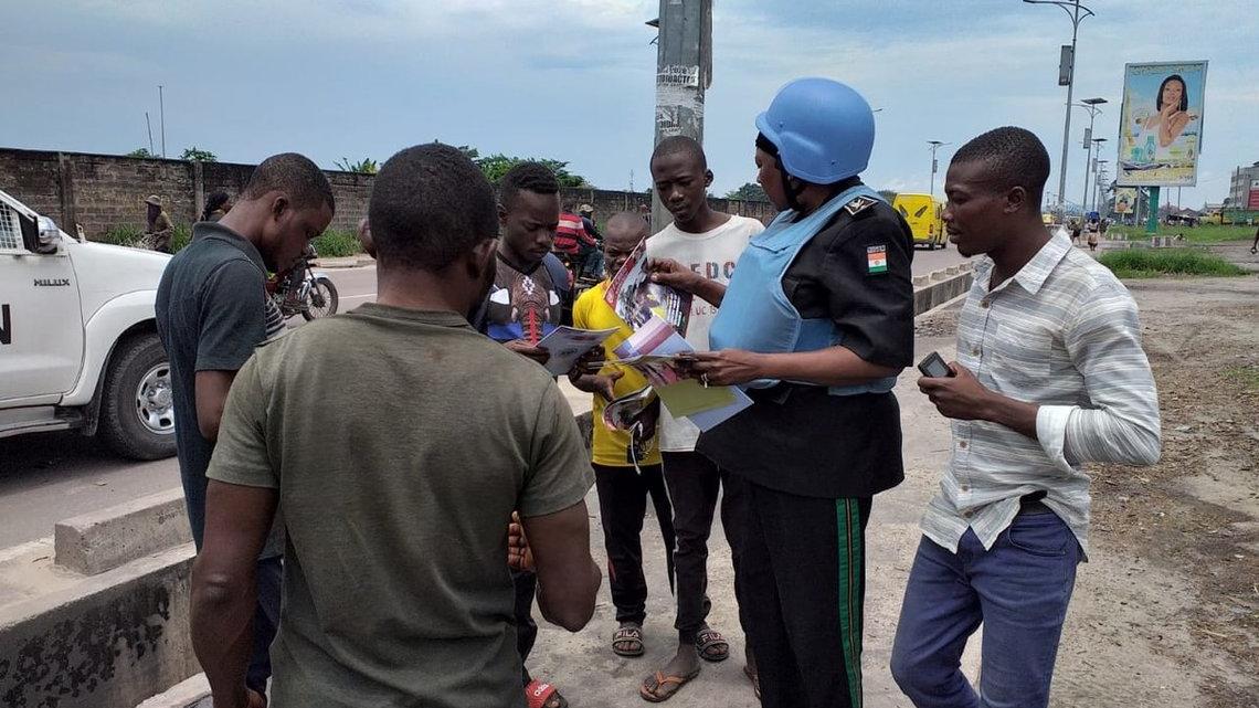 Une équipe de patrouille de la Police onusienne sensibilise des jeunes sur le mandat de la MONUSCO