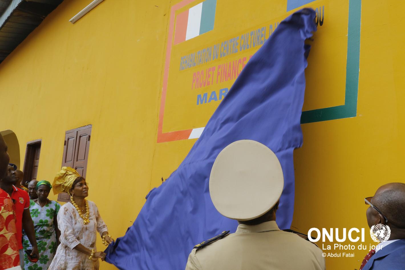 15 juillet 2016ONUCILa Représentante spéciale inaugure le tout nouveau Centre culturel d’Agnibilekrou nouvellement réhabilité par l’ONUCI dans le cadre de son Programme de projets à impact rapide (Agnibilekrou, juillet 2016)