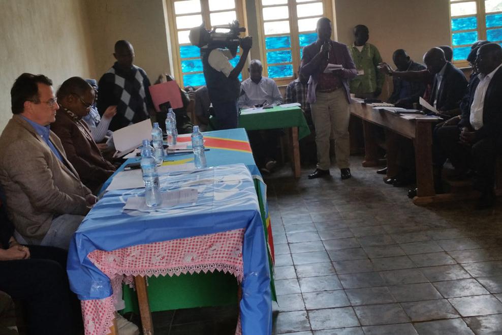 David Gressly, Représentant adjoint de la MONUSCO, Cecila piazza, cheffe de bureau de la MONUSCO-Bunia et Jefferson Abdallah Pene Mbaka, gouverneur de la province de l’Ituri, au cours d'un atelier de pré-dialogue à Fataki…