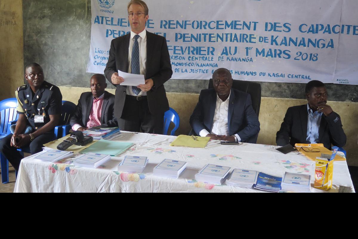 Charles Frisby, Chef du bureau de la MONUSCO Kananga au cours d'une formation en faveur de 40 agents pénitentiaire. Photo MONUSCO/Laurent sam OUSSOU Kananga, le 28 février 2018 – Le ministre provincial de la Justice et Garde…