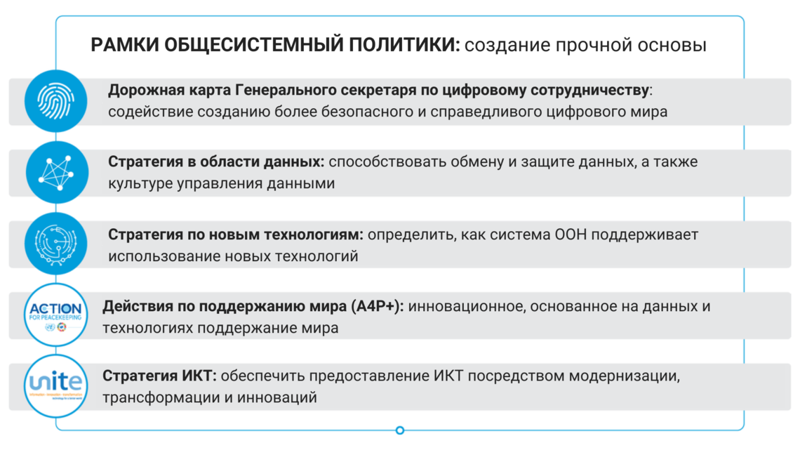 Для достижения этой цели Стратегия основывается на более ранних и текущих целевых инициативах и стратегиях в таких областях, как разведка в операциях по поддержанию мира, оценка эффективности для планирования и принятия решений, информационная безопасность или управление данными, а также позволяет решать такие проблемы, как использование технологий негосударственными субъектами в качестве оружия, кибератаки, недостоверная информация, дезинформация и высказывания, разжигающие ненависть, а также ключевые этические вопросы, связанные с использованием цифровых технологий в операциях Организации Объединенных Наций по поддержанию мира. В то же время Стратегия нацелена на максимальное использование потенциала существующих и новых технологий, рассматривая цифровые технологии в качестве потенциального инструмента, позволяющего в рамках операций Организации Объединенных Наций по поддержанию мира добиваться основанного на анализе и ориентированного на перспективу понимания условий конфликта, укреплять охрану и безопасность своего персонала, а также осуществлять гибкое и оперативное выполнение мандата. Подготовка миротворческой деятельности к будущему требует решения как сквозных, так и культурных вопросов, а также принятия целенаправленных мер по поддержке операций по поддержанию мира на местах. Всеобъемлющий характер этого начинания позволяет предположить, что оно представляет собой не что иное, как цифровую трансформацию операций Организации Объединенных Наций по поддержанию мира.