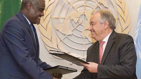 19 апреля 2017 года в ходе первой ежегодной Конференции Организации Объединенных Наций и Африканского союза Генеральный секретарь Организации Объединенных Наций и Председатель Комиссии Африканского союза (АС) подписали Совместный рамочный документ Организации Объединенных Наций и Африканского союза об укреплении партнерства в области мира и безопасности. Это позволило укрепить сотрудничество между двумя организациями, которое становится все более тесным после подписания ими в 2006 году десятилетней программы по укреплению потенциала Африканского союза (A/61/630). Работа Организации Объединенных Наций строится вокруг многих тематических направлений, а Департамент по политическим вопросам и вопросам миростроительства (ДПВМ) возглавляет работу по вопросам сотрудничества в области мира и безопасности.