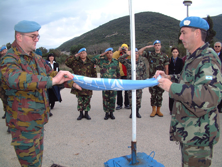 Captain Marc van Cauwenbergh of Belgium (left) and Major Raul Bertoia of Argentina (right) of UNMOP folding the UN flag after lowering ceremony while other UN Military Observers salute.Cape Ostra, Prevlaka Peninsula.