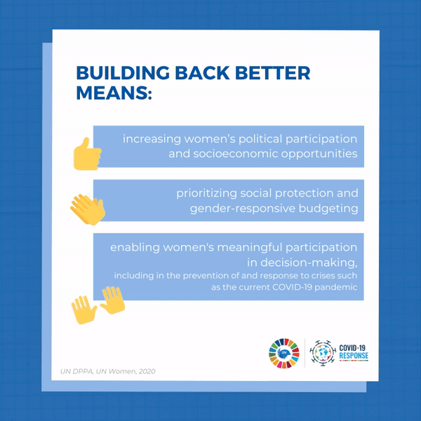 妇女领袖处于抗击2019冠状病毒病的前线,帮助减轻与大流行病有关的政治风险。与此同时,大流行病可能逆转妇女在参与和平与政治进程方面最新取得的进展,并且已经导致妇女和女童面临更大的贫穷和暴力风险,例如各地记录到的性暴力和性别暴力事件出现大幅增加。