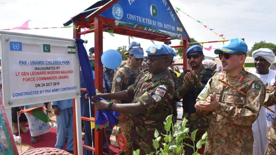 وفي كلمته بحفل التسليم، أشاد الفريق ليونارد أنغوندي بالمجهود الكبير الذي بذله حفظة السلام الباكستانيون في تشييد الملعب بموارد محلية. وأشار الى أنَّ تسليم حديقة الأطفال للمجتمع المحلي هو ريشة أخرى بقبعة حفظة السلام في تعزيز السلام تحت رعاية مبادرة العملية الانتقالية لليوناميد في بناء السلام.