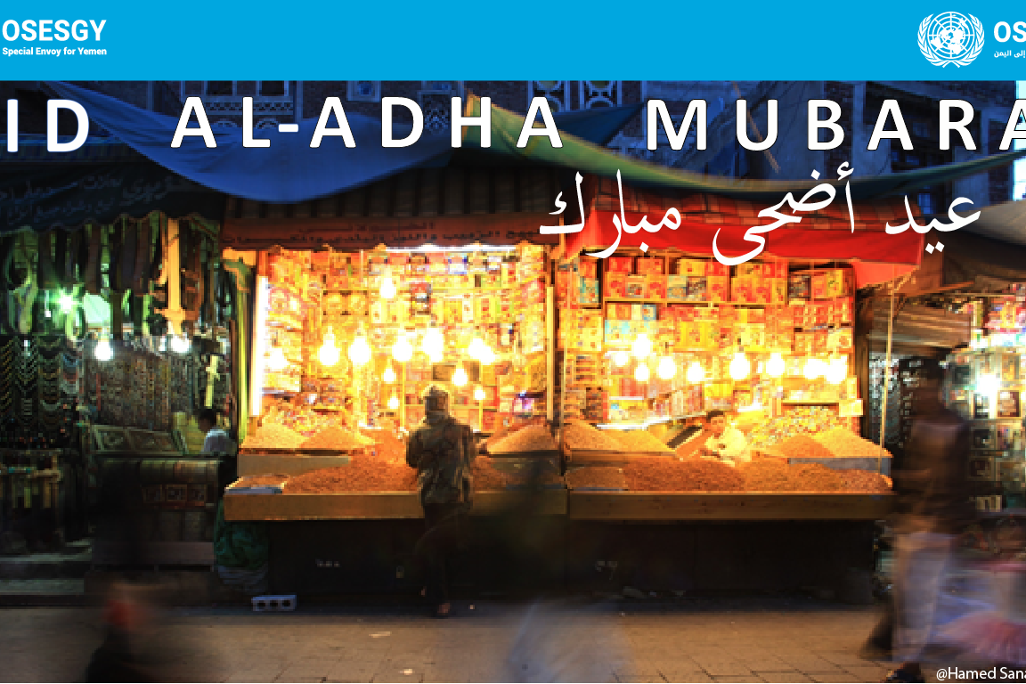 عمان، 31 تموز/يوليو 2020 - يتقدّم المبعوث الخاص للأمين العام للأمم المتحدة إلى اليمن، مارتن غريفيث، بتحياته القلبية وتمنياته الطيبة لجميع اليمنيين بمناسبة عيد الأضحى المبارك. وقال غريفيث: "أتمنى لكم جميعاً ولأحبائكم عيداً…