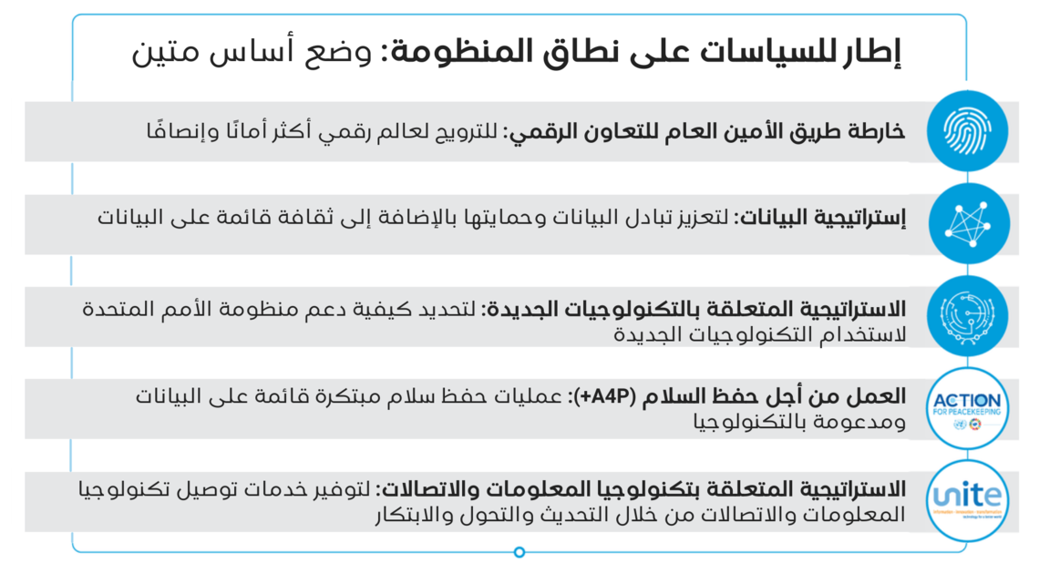 ولتحقيق هذه الأهداف، تبني الاستراتيجية على المبادرات والاستراتيجيات السابقة والحالية ذات الصلة في مجالات مثل استخبارات حفظ السلام وتقييم الأداء للتخطيط واتخاذ القرار وأمن المعلومات أو إدارة البيانات، وتتصدى للتحديات مثل تسليح التكنولوجيا من قبل الجهات الفاعلة غير الحكومية والهجمات الإلكترونية والمعلومات المضللة والمغلوطة وخطاب الكراهية والمسائل الأخلاقية الرئيسية المتعلقة باستخدام التكنولوجيا الرقمية في عمليات حفظ السلام التابعة للأمم المتحدة.