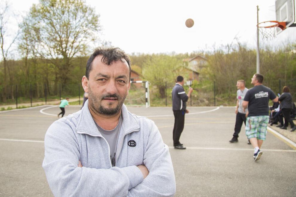 Agron Shllaku stands in an UNMIK-sponsored playground built in 2018 in the multiethnic village of Vidaje/Vidanje. Shllaku says: “The United Nations has brought the children together. This is where they meet and hang out. The…