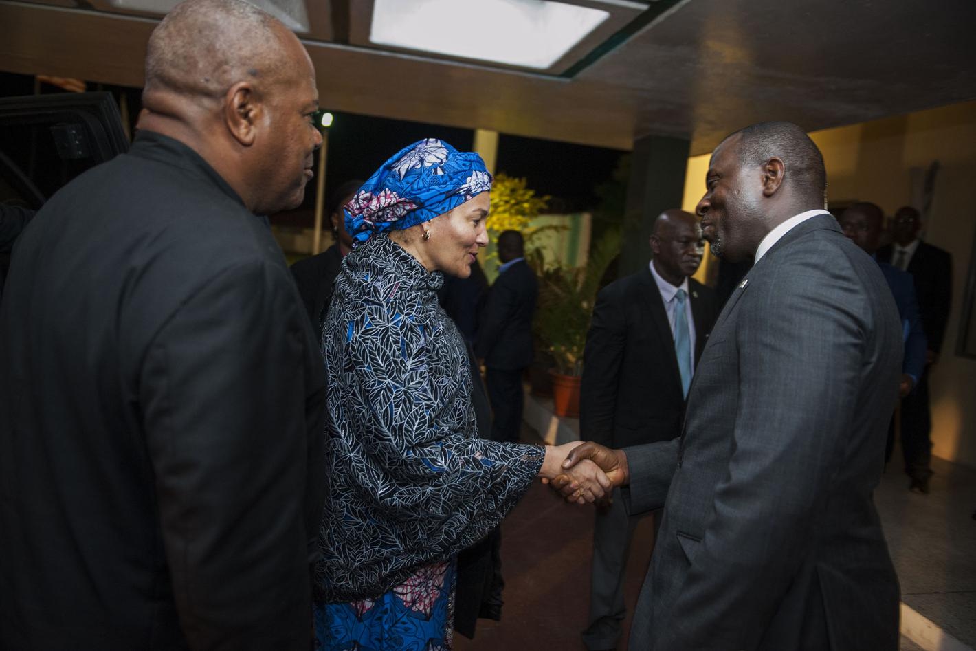 The United Nations Deputy Secretary General, Ms. Amina J. Mohammed (center), greets the acting Minister of Foreign Affair of Liberia, Elias B. Shoniyi (right), at her arrival at the Roberts International Airport in Harbel…