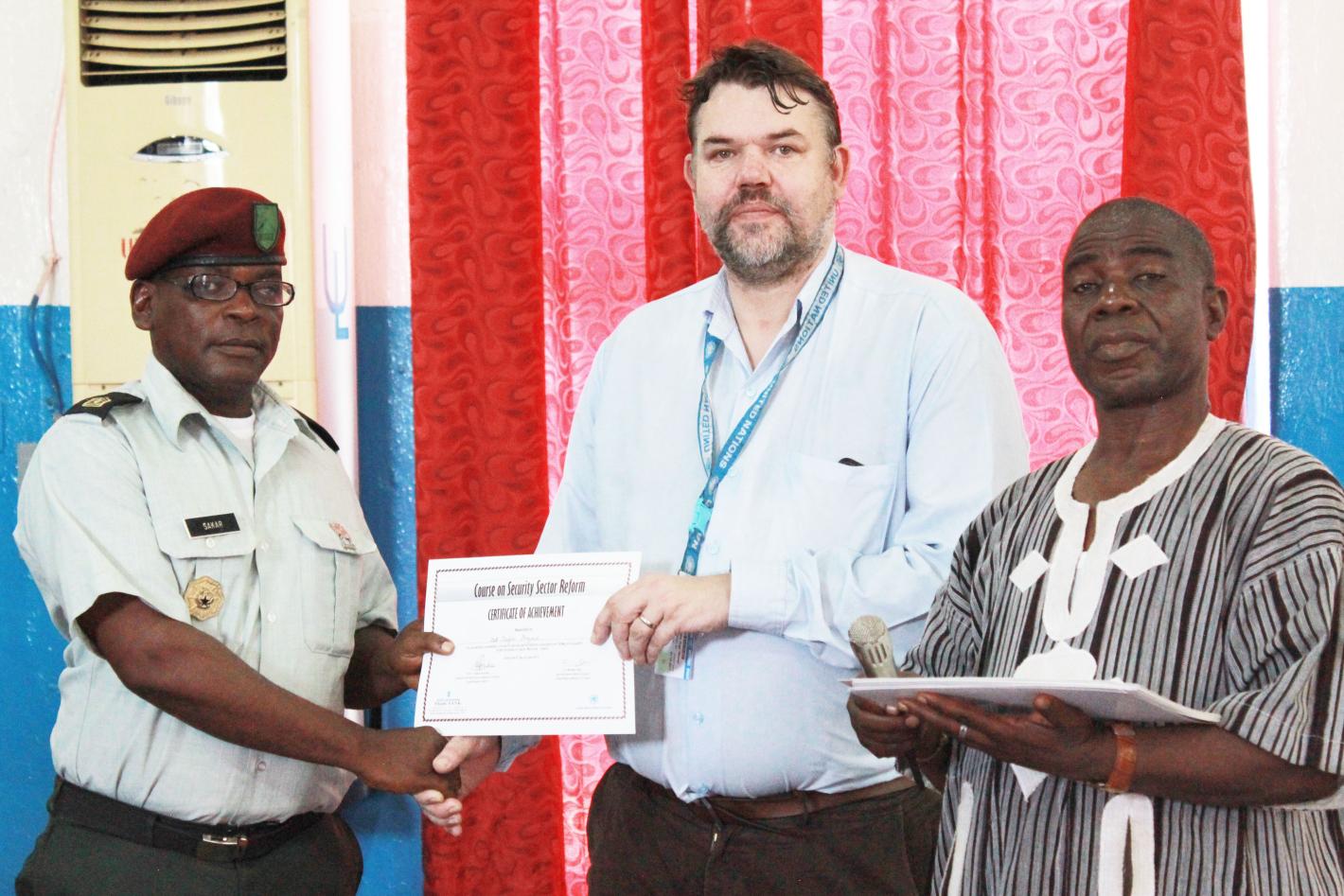 Michael Page, Head of Security Sector Reform Unit at UNMIL (middle) hands over a certificate to a trainee at the end of a five-day training session on Security Sector Reform in Monrovia, Liberia. Monrovia – On 9 June 2017…