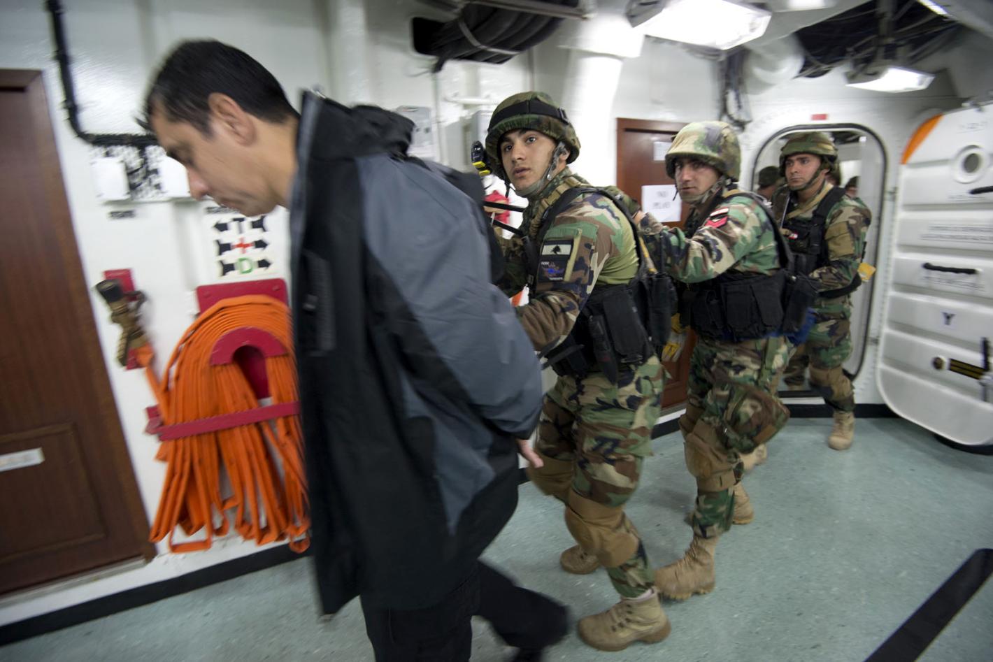 During the training exercise LAF Navy soldiers apprehend sailors of the intercepted boat. Out at sea a crackle comes over the radio: “Motor Vessel Sam, this is the Lebanese Navy. You cannot enter the Lebanese territorial…