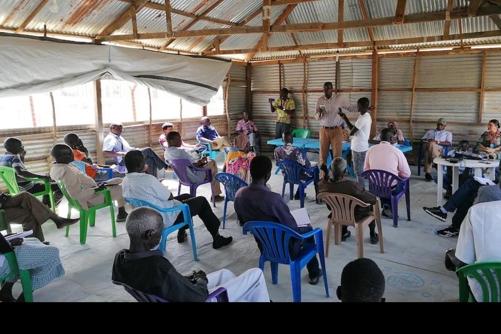 Learning by doing: adequate social distancing at a Malakal awareness-raising session on COVID-19 prevention. Health professionals have raised awareness among the leadership of the almost 28,000 internally displaced people…