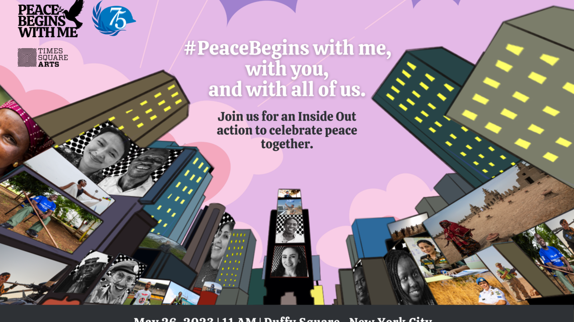 As we commemorate UN Peacekeeping's 75th anniversary, we invite you to join us for an Inside Out action at 11am EST on 26 May in Times Square to celebrate all the people who work together to build and maintain peace across the world, from peacekeepers to community members and local influencers in the places where our missions operate. For 75 years, UN peacekeeping has made a tangible difference to the lives of millions of people caught up in conflict. The Inside Out action is a way to thank peacekeepers, past and present, for their service and sacrifice, and pay tribute to the courageous people who brave conflict and strive for peace in the face of adversity. They inspire us all to take action in the knowledge that #PeaceBeginsWithMe.