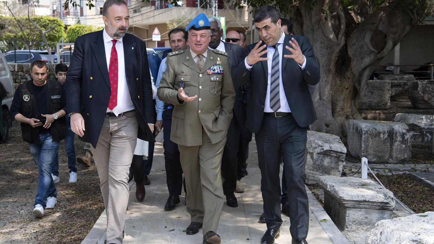 UNIFIL head Maj. Gen. Stefano Del Col (centre) with Mr. Karl von Habsburg (left), President of Blue Shield International, and Mr. Sarkis Khoury from the General Directorate of Antiquities of Lebanon, during the Blue Helmet Blue Shield forum in Tyre on 5 April 2019.