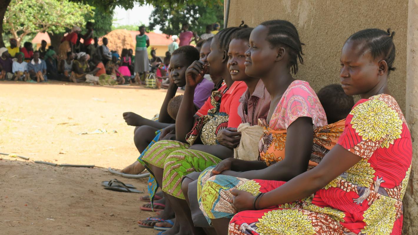 Women and children sheltering under trees and church buildings in Yei town