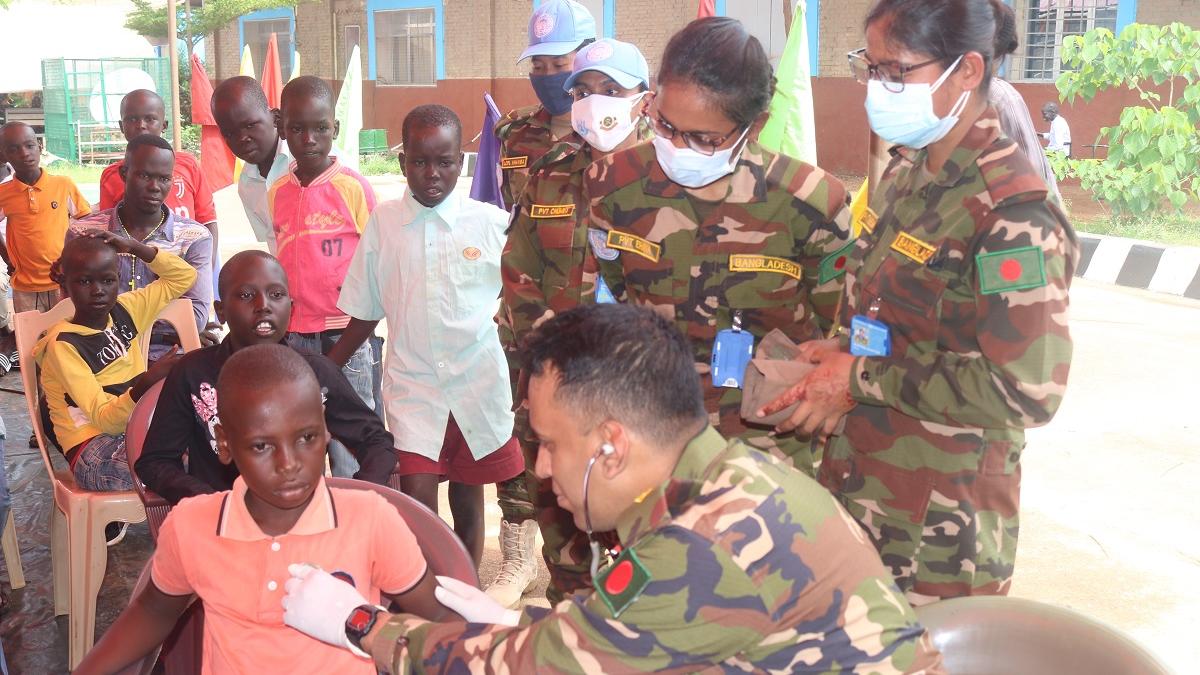 Commemorating International day of Families, UNMISS peacekeepers from Bangladesh handed over clothing, hand sanitizers, sports equipment; conducted free medical checkups for 66 orphaned children in Wau.