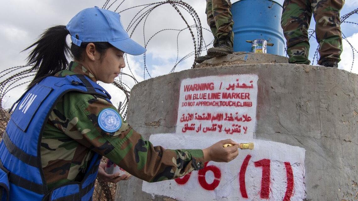 Cambodian peacekeepers give finishing touches to a blue barrel along the Blue Line south of the Lebanese village of Yaroun on 02 November 2021. (UN Photo / Pasqual Gorriz)