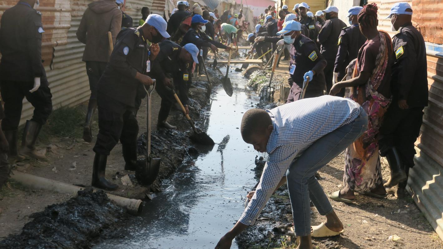 Life for families displaced by conflict is difficult enough. But living in crowded conditions with access to only very basic services can create even greater challenges.Around 42,000 people live in the United Nations Protection of Civilians site in Malakal. To help improve the environment, a collective clean-up campaign was undertaken to clear blocked drainage systems so that stagnant water can flow more smoothly into main channels, improving sanitation. Litter such as plastic bags and bottles was also collected. The initiative was led by United Nations Police (UNPOL), serving with the UN Mission in South Sudan (UNMISS), including officers from Rwanda, the International Organization for Migration, the Danish Refugee Council, and community leaders.The Head of the UNMISS Field Office in Malakal, Alfred Orono Orono, stressed the importance of a clean environment for community safety.“This initiative will also foster trust and cooperation between peacekeepers, humanitarian partners, and the local population,” he said. “I urge the community to take this positive example to heart, incorporate it into their daily routines, and maintain a hygienic neighbourhood.”UNPOL Commanding Officer, Nelson Bugingo, underscored the importance of teamwork and shared responsibility. “Improving the quality of life for residents is essential for achieving lasting peace in communities. By fostering connections, individuals can share experiences and work together to address the many challenges they face,” he said. The initiative attracted many community members, including youth and women, who demonstrated the power of collective action. “This effort not only benefits the displaced communities but inspires all of us to contribute to promoting and leading healthier lives,” said Bolis Bol, Chairperson of the Community Watch Group.