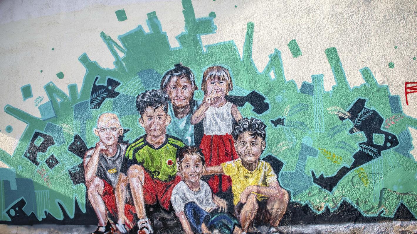 As the young participants worked to create this mural, the residents of the neighourhood joined the group to help them work on their pieces.
