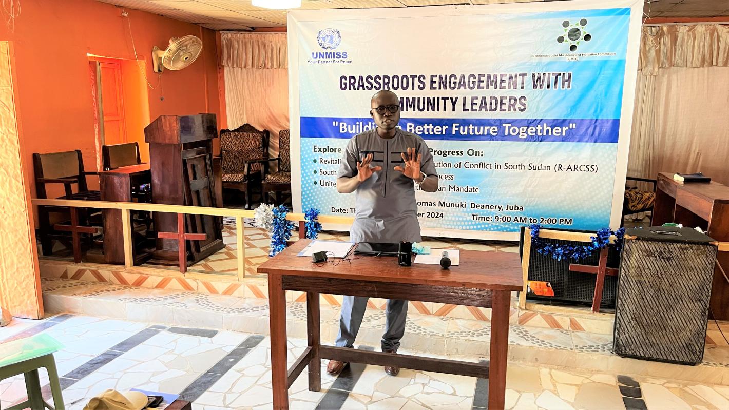CENTRAL EQUATORIA - Cecilia Kiden Isaac, a 51-year-old educator in Juba, is passionate about empowering her community through education.At a recent outreach event organized by the United Nations Mission in South Sudan (UNMISS), in collaboration with the Reconstituted Joint Monitoring and Evaluation Commission (R-JMEC) and the Ceasefire & Transitional Security Arrangements Monitoring & Verification Mechanism (CTSAMVM), she highlighted the urgent need to raise awareness among citizens about a variety of issues affecting their lives.“After today’s session, I feel much better informed about some of the critical challenges our country is currently facing,” she said.Held at St. Thomas Deanery in Munuki, a neighbourhood in the capital, the grassroots engagement happening attracted more than 60 residents, including elders, clergymen, and youth. They turned up to learn more about the status of the implementation of the revitalized peace agreement, the constitution-making process, and in what ways the peacekeeping mission and the UN family contribute to developments.Ms. Isaac grasps the importance of civic engagement, including citizens’ participation in elections."Indifference to or a lack of knowledge about makes it possible for politicians to avoid accountability,” she stated, adding that local leaders, not least those of faith-based organizations, have an important role to play when it comes to keeping community members aware of what is going on.UNMISS Political Affairs Officer Garang Yach James Akot agreed with her, pointing out that churches often have an unfulfilled potential to be more powerful institutions stakeholders in South Sudanese society.“Many of their leaders, like their congregations, lack information on key issues, which means that people who receive most of their news during church activities don’t get the knowledge they need to effectively influence decisions that are relevant to them,” he opined.During the event, held under the theme "Building a Better Future Together," participants discussed and asked questions about a wide variety of topics, including the future of the transitional government, civil society participation in implementing the peace agreement, and the importance of being able to hold political leaders accountable.“Understanding national issues is a must to make informed decisions. Our initiatives to connect with people at the grassroots level go beyond raising awareness; they aim to empower communities to understand and voice their concerns,” said Reuben Inaju, Head of the UNMISS Community Outreach Unit.Energized and equipped with facts, Cecilia Kiden Isaac is now ready to share new insights with her young learners, hoping to prove that education can make a real difference also in South Sudan.