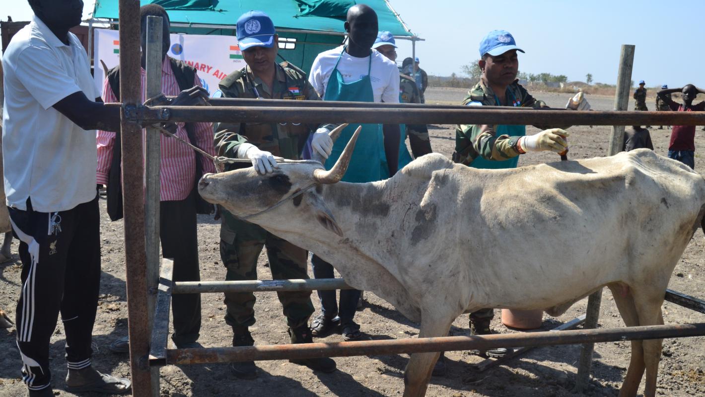 UPPER NILE – In South Sudan, livestock is one of the main income sources for many households. However, scarcity of adequate veterinary support continues to prove a challenge for animal breeders.Enter Indian veterinarians serving with the United Nations Mission in South Sudan (UNMISS)—these dedicated peacekeepers deployed to Malakal in Upper Nile recently held a free veterinary camp to support livestock owners.“We treated more than 1,533 cattle, goats and sheep for various diseases, including parasitic infections, tick infestations and anaemia,” said Lieutenant Colonel Dinesh Nagar, an Indian vet.Vitally, peacekeepers enhanced capacities among animal owners by training them on detecting early symptoms of common ailments and educated them on the benefits of rotational grazing to protect their habitats.“We consistently engage with animal owners and raise awareness about preventive measures, handling of food of animal origin and other best practices in livestock management that ensure optimum health and productivity,” revealed Dr. Nagar.“The objective is to encourage sustainable livestock rearing practices so that they are able to make a consistent living,” he added.For Samuel Peter, a cattle owner, such interventions by UNMISS have proven to be a beacon of hope. “We were lacking veterinary facilities in this area and Indian peacekeepers have been a godsend,” he stated with gratitude. “Not only have they helped treat our animals, but we have learned a lot about animal and disease management,” he added. For Samuel and other livestock owners, the assistance rendered by Blue Helmets have had an immediate impact, while for peacekeepers, such interactions with local communities go to the heart of the UN Peacekeeping mission’s mandate.“We are here to help build a durable peace,” said Dr. Nagar. “That peace starts with empowering local communities.”