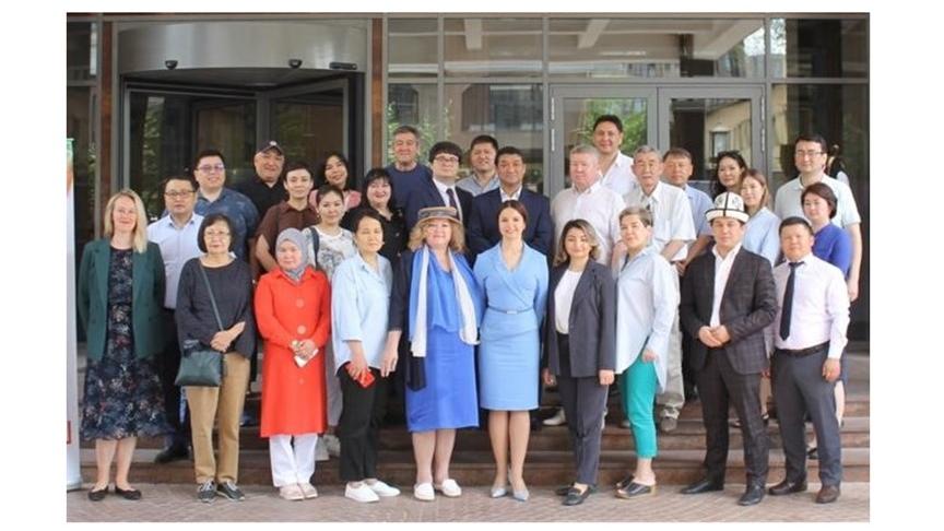 Four individuals gathered around a table with a blue and white patterned cloth, one in a uniform with a blue beret and ID badge instructing three others dressed in blue garments with yellow accents, in a dimly lit indoor setting