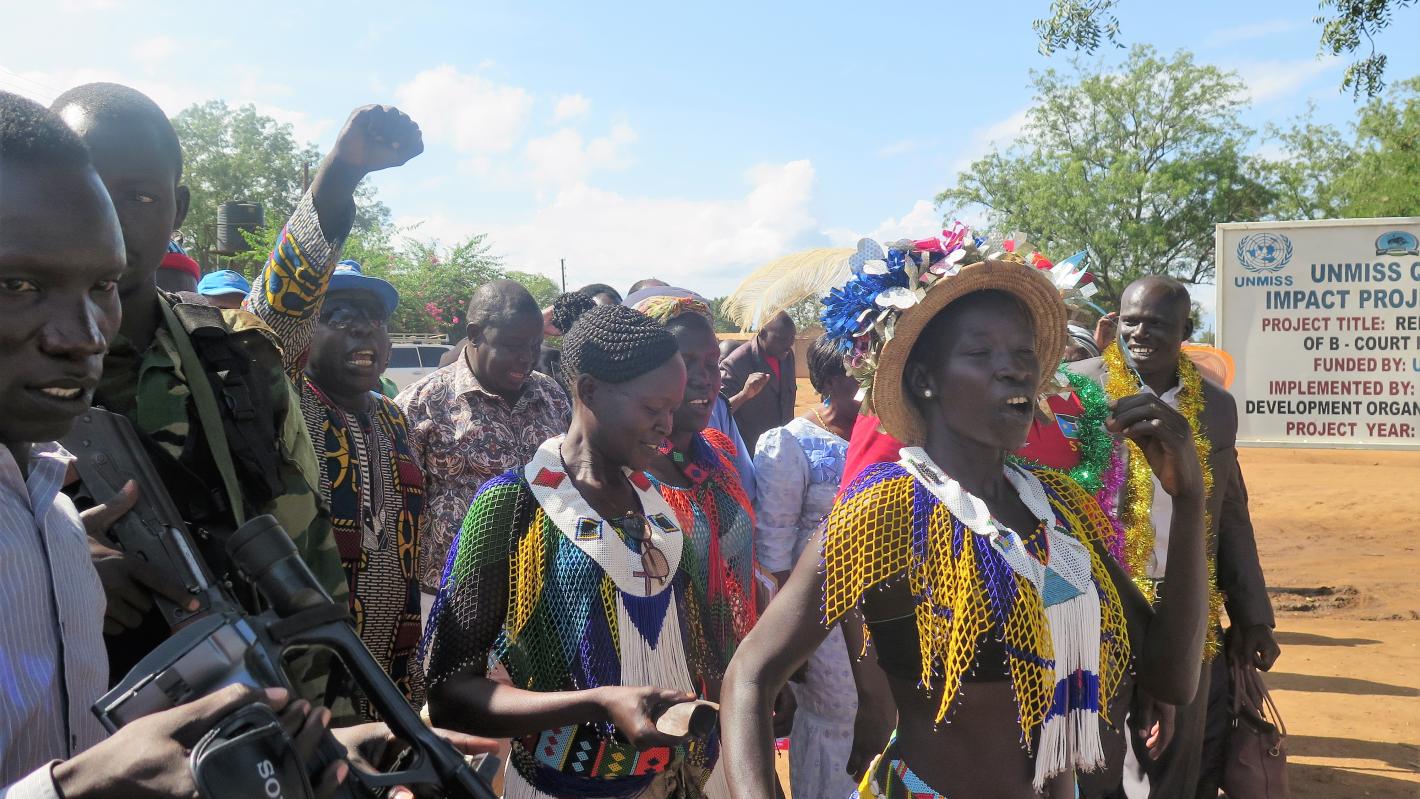 Citizens in Torit danced with glee during an opening ceremony to celebrate the completion of two new Quick Impact Projects in the town – and they had every reason to do so. Over the past 9 months, the town’s inhabitants have keenly observed construction work aiming to rehabilitate a traditional court house and build solar-powered water and sanitation facilities at the local police station.