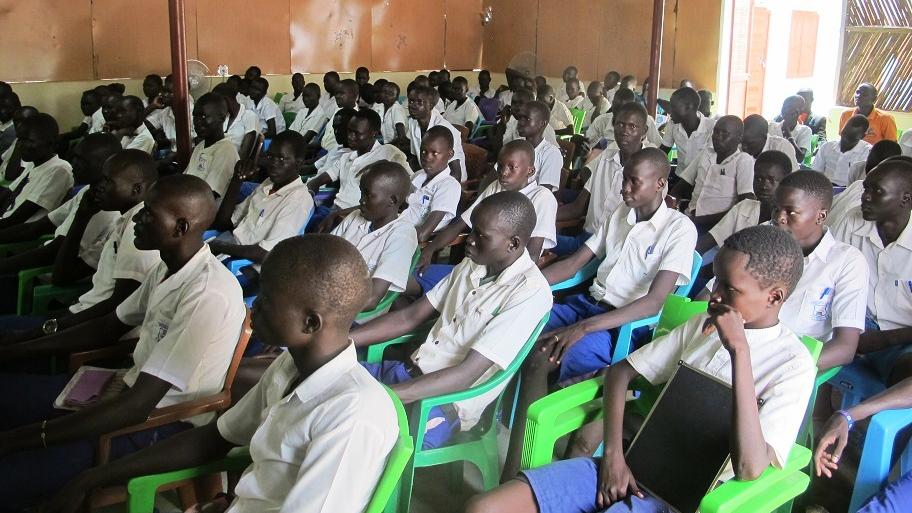 School children in Rumbek at an UNMISS-led workshop discussing how to empower girls and women. The overwhelming majority of boys in the photo underscores a key challenge for girls: access to education.