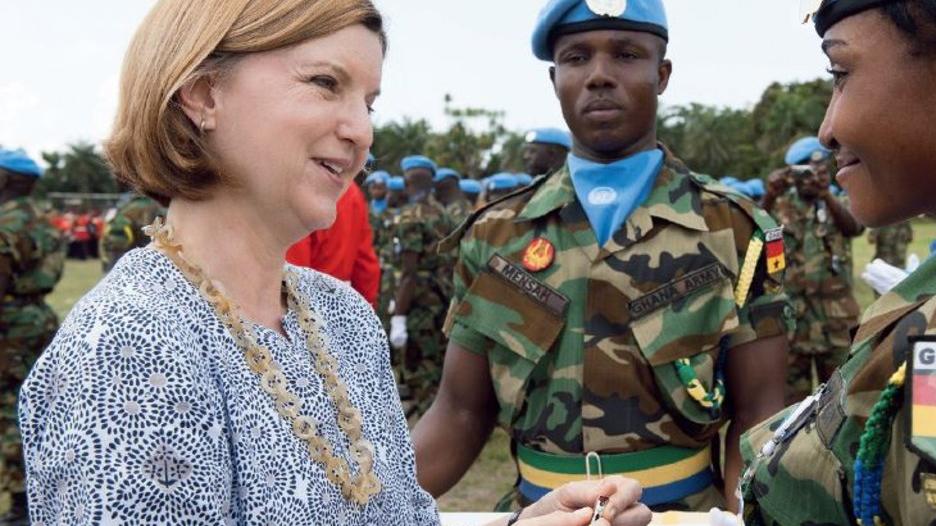 Karin Landgren at a medal parade for a Ghanaian military contingent in Buchanan, Grand Bassa County.Photo: Staton Winter | UNMIL | 16 Nov 12