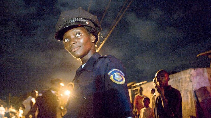 Sianneh Passaue, a female Liberian police officer, stands on night patrol along Old Road in Monrovia. Photo: Christopher Herwig | UNMIL | 14 May 08