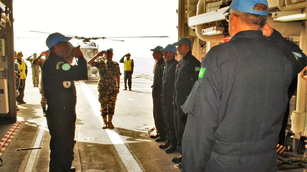 The Deputy Force Commander (DFC) of UNIFIL, Brigadier General Shivaram Kharel recently visited the flagship of the Maritime Task Force (MTF), the Corvette "Barroso", on the high seas. The visit was conducted by the MTF Commander, Rear Admiral Sergio Chaves Jr, who is currently embarked on board the Brazilian ship, from where he controls all activities of the Area of Maritime Operations (AMO).
