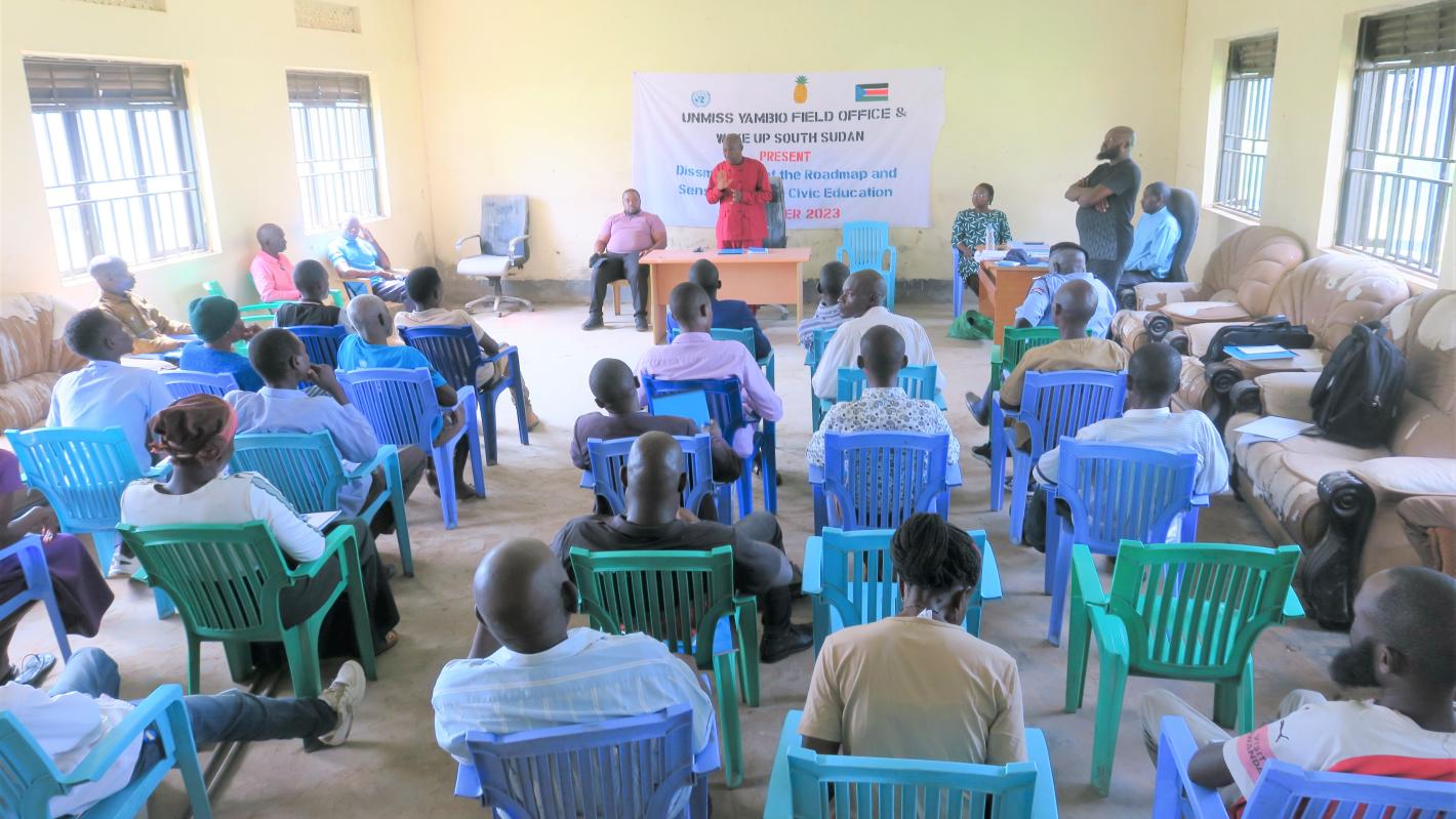 WESTERN EQUATORIA – As South Sudan begins gearing up for its first post-independence elections in December 2024, it’s now more vital than ever before for all citizens to be fully aware of the current political landscape as well as the status of outstanding benchmarks contained within the Revitalized Peace Agreement of 2018.In Western Equatoria state, therefore, the United Nations Mission in South Sudan (UNMISS) partnered with Wakeup South Sudan, to raise awareness on the current state of play through a series of workshops that gave participants the chance to understand and own peace processes in this young nation, especially electoral preparations.“These sessions went a long way in equipping us with greater knowledge on what our leaders are doing to prepare for our first general elections,” said Ismail Wanja Damana, an elder from Mvolo county. “We shall share the knowledge we gained within our communities, so that other people become well-informed as well,” he added.Joyce Angbatika Bullen, another participant, highlighted the criticality of full and equal participation by all citizens, especially women, to ensure that the elections are free, fair and credible.“It is a wake-up call for our country. Our involvement as women is vital and with information we acquired today, we are very well equipped to lobby for our right to shape our country’s future,” stated Joyce passionately. The initiative was highly commended, with participants hoping for more such similar sessions to be made available to the public. “It is up to us as South Sudanese to take the lead in building the nation we want to live in and we are grateful for the support we are receiving from our partners in peace,” averred Charles Elisama, Commissioner of Ibba county. Pastor Stephen Mwangi, a facilitator from Wakeup South Sudan, agreed.“We are touring across the state to sensitize citizens on the status of peace implementation and elections because we know that many citizens lack knowledge about their roles and responsibilities. We need to empower votes,” he stressed.For his part, Rudolf Esombu Effange, a Civil Affairs Officer with the UN Peacekeeping mission, reiterated Pastor Mwangi’s sentiments.“Informed electors form the backbone of any polling process,” he affirmed.The training was rolled out across 10 counties in Western Equatoria with 30 participants attending each session.