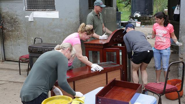 They help the adults carry furniture from the buildings and wash it clean. Floors are swept and dirt is scrubbed from the walls. What little bedding the children have is washed and aired in the hot sun. Bathrooms are scrubbed clean and disinfected to reduce the risk of waterborne disease. Overgrown weeds are cut back to make it safer for the children and to enable vegetables to be grown.