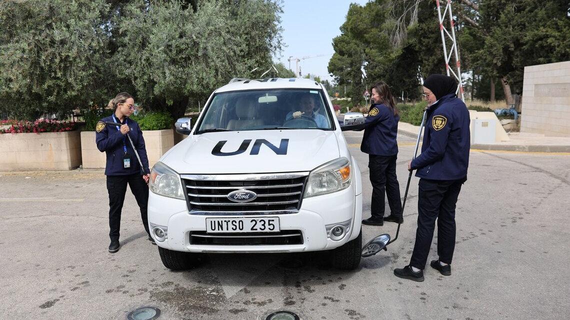At the main entrance of the United Nations Truce Supervision Organization (UNTSO) Jerusalem compound, an all-female team stands united, a force to be reckoned with. They demonstrate unwavering strength and dedication, performing their duties with precision and grace, like their male colleagues. Together, they exemplify professionalism, teamwork, diversity, and excellence, upholding the values of peace and unity, the trademark of UNTSO.
