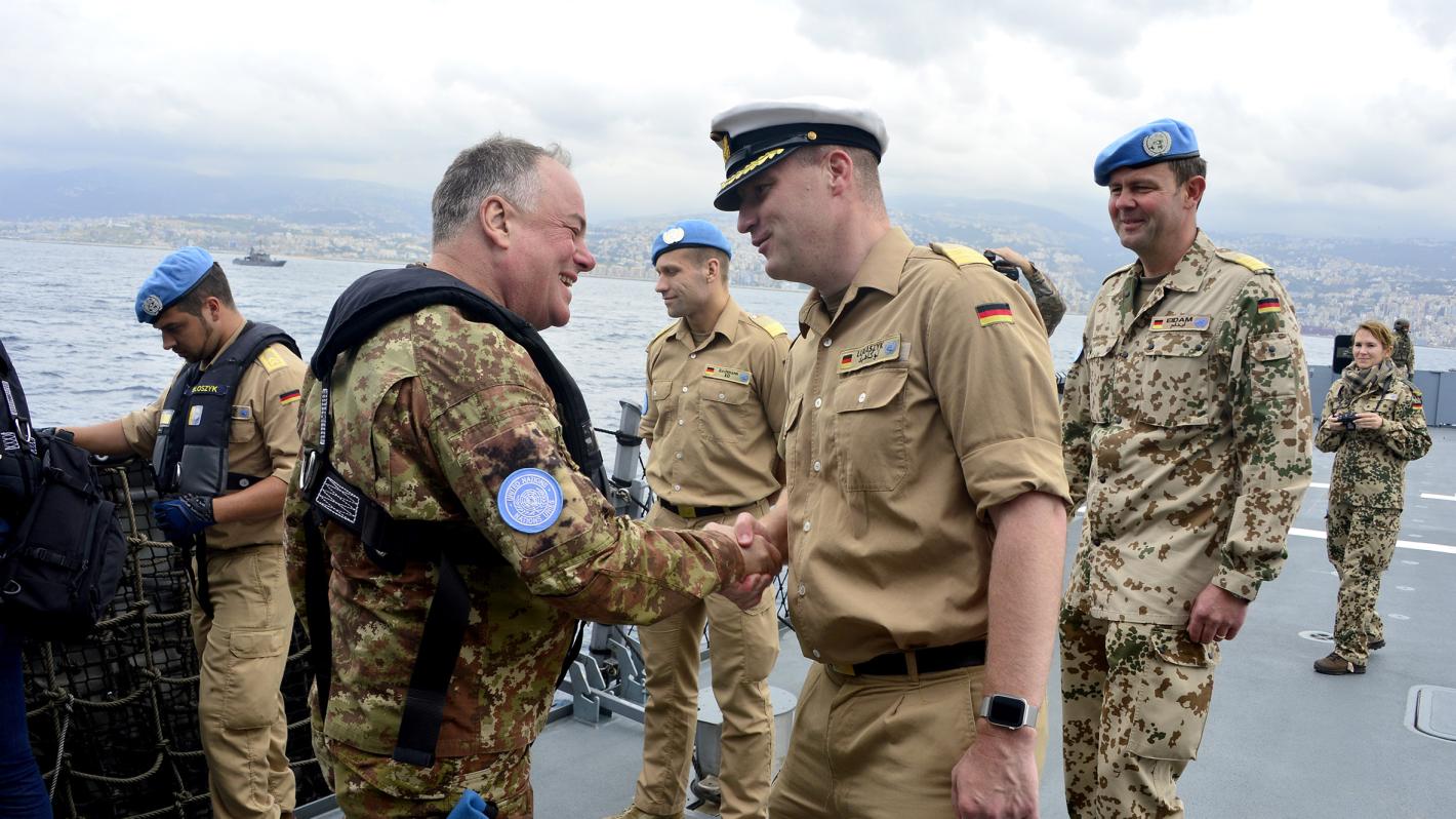 The commander of the German Corvette “OLDENBURG,” Stephan Lukaszyk, welcomes Maj. Gen. Del Col onboard his ship in the Beirut Naval Base.