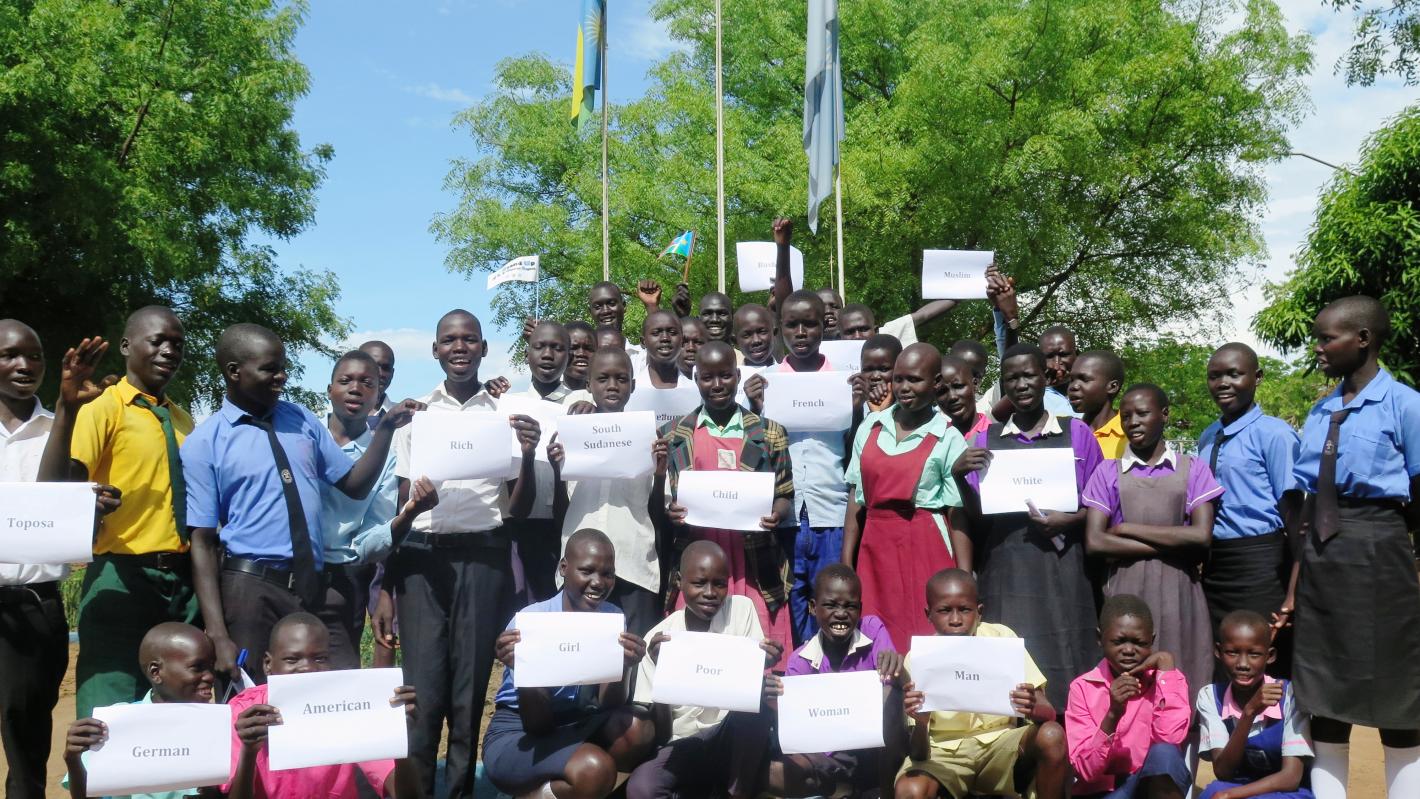 The group of young people gathered under the shady tree in Torit are holding signs reading “American”, “German”, “South Sudanese”, “Woman”, “Man”, “Rich”, “Poor”, “Muslim”, “Christian”.