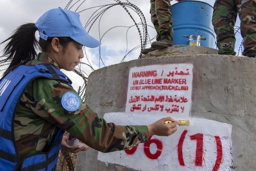 Cambodian peacekeepers give finishing touches to a blue barrel along the Blue Line south of the Lebanese village of Yaroun on 02 November 2021. (UN Photo / Pasqual Gorriz) Long arrays of blue barrels dotted along the Blue…