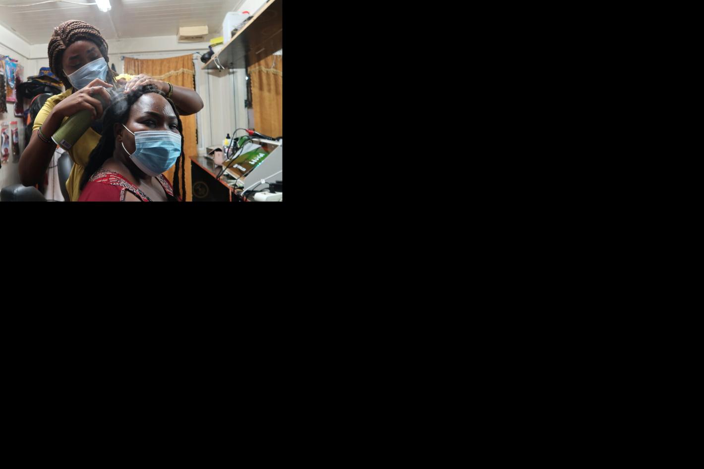 Ana James, 24, and Sunday Chol, 23, are sought-after hairdressers in Malakal, South Sudan. Both have no formal training in the beauty industry, but are passionate about entrepreneurship and fashion. Photo by Samson Liberty…