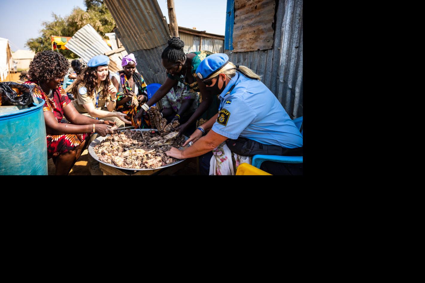 UN police officer assisting women at the Yei Road checkpoint with cooking ahead of a community gathering with South Sudan police. Internally displaced persons, residents of neighbouring communities, police and military…