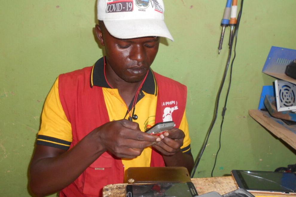 Jonas Byaruanga: How my life of a jobless young man was changed by MONUSCO. Photo MONUSCO/JEAN-TOBIE OKALA Ten months earlier, some 20 young men from Bunia, Ituri, underwent a training in cell phone repair given by MONUSCO…