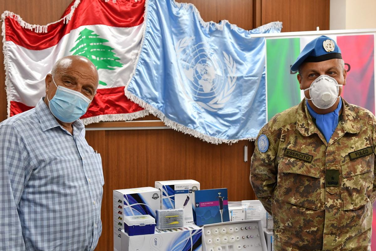 UNIFIL Sector West Commander Brig. Gen. Diego Fulco (right) with the Mayor of Tyre Hassan Dbouk during a donation ceremony on 8 June 2020. (Photo: Major Igor Piani / UNIFIL) UNIFIL Italian peacekeepers donated 210 PCR kits…
