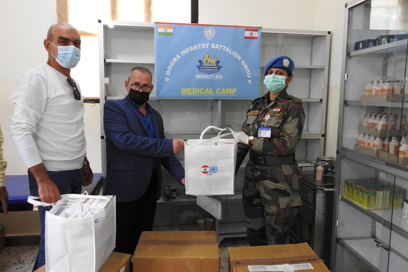 Major Ravdeep Kaur of UNIFIL (right) hands over 23 varieties of medicines to the head of Social Development Centre for the villages of Al Arkoub Union of Municipalities, Mohammad Saadi, on 29 May 2020. Photo: Corporal Gautam…