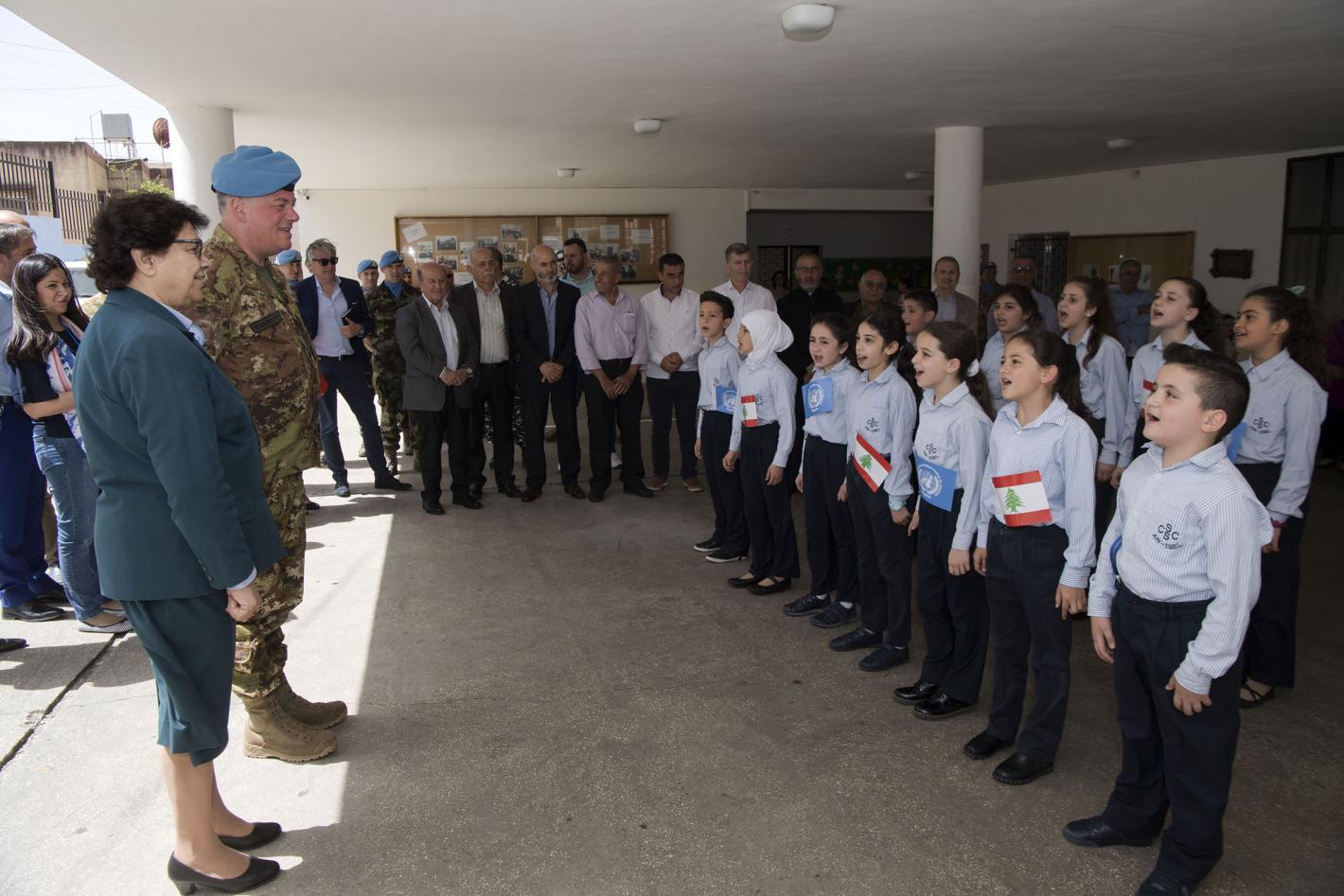 Students of St. Joseph School in Ein Ebel, south Lebanon, greet UNIFIL Head of Mission Maj. Gen. Stefano Del Col as he arrives in the school to see their cross-cultural event with a school in Italy. At the heart of UNIFIL’s…