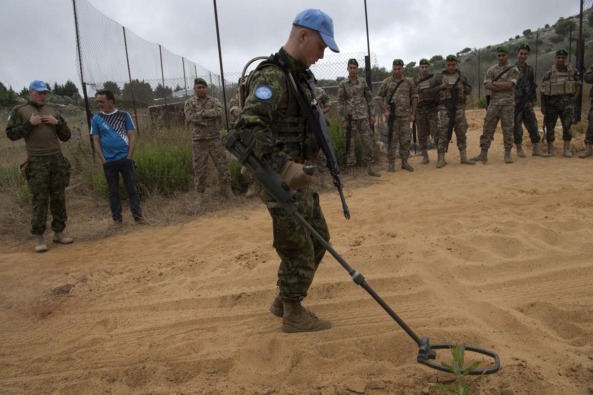 A UNIFIL Estonian peacekeeper demonstrates how to detect IEDs to LAF soldiers during a joint training. The soldiers from the Lebanese Armed Forces (LAF) watch intently as a small unit of UNIFIL Estonian peacekeepers…